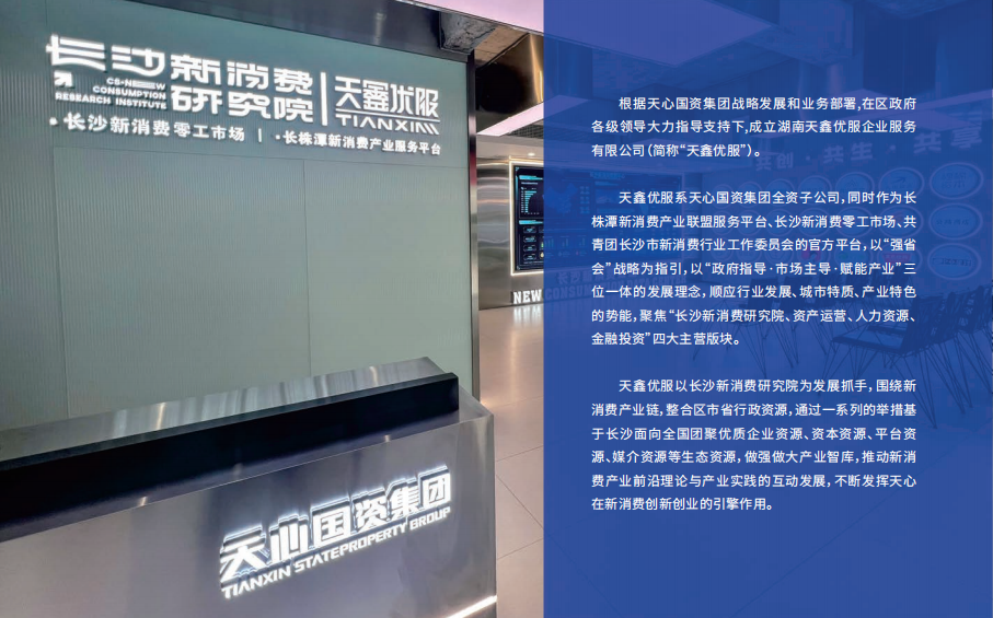 2022年10月31日,由湖南省商務(wù)廳指導(dǎo)、長沙市商務(wù)局和天心區(qū)人民政府共同發(fā)起,正式授牌長沙新消費研究院,由天心國資集團全資企業(yè)湖南長沙新消費產(chǎn)業(yè)研究有限公司運營。