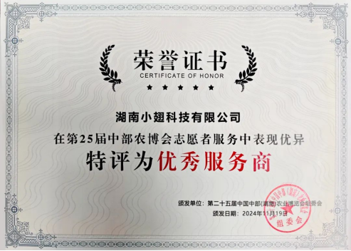 2024年5月,“小翅俠”志愿者服務(wù)團(tuán)隊(duì)首次在2024年“機(jī)甲大師超級(jí)對(duì)抗賽上”亮相,獲得了主辦方、指導(dǎo)單位及政府對(duì)“小翅俠”志愿者服務(wù)團(tuán)隊(duì)優(yōu)質(zhì)服務(wù)的高度認(rèn)可與贊譽(yù)。2024年11月,“小翅俠”志愿者服務(wù)團(tuán)隊(duì)亮相“第25屆中國(guó)中部(湖南)農(nóng)業(yè)博覽會(huì)”,再次以優(yōu)質(zhì)服務(wù)獲得了各方的高度認(rèn)可與贊譽(yù),并被組委會(huì)評(píng)選為“優(yōu)秀服務(wù)商”的榮譽(yù)稱號(hào)。這不僅是對(duì)“小翅俠”志愿者團(tuán)隊(duì)的肯定,更是對(duì)志愿者們青春擔(dān)當(dāng)?shù)恼J(rèn)可。