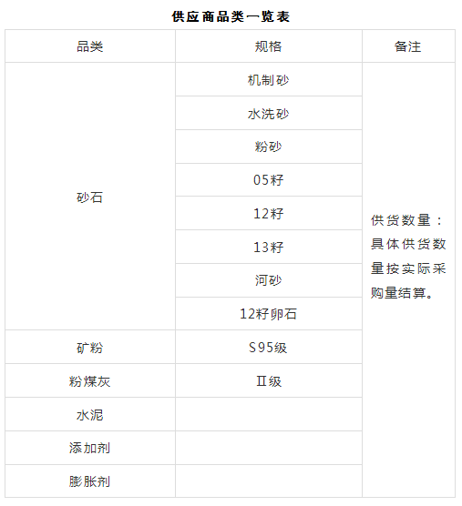 本次征集活動(dòng)為2025年度第一次原材料供應(yīng)商的征集,征集供應(yīng)商品類(lèi)為:砂石、水泥、粉煤灰、礦粉、膨脹劑、減水劑、外加劑等,現(xiàn)每年總需求約200萬(wàn)噸。